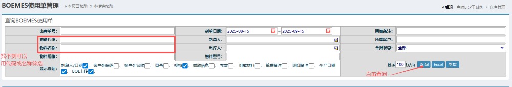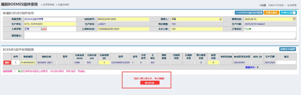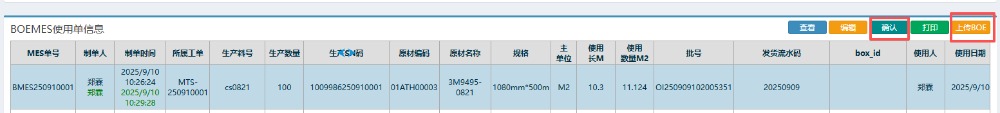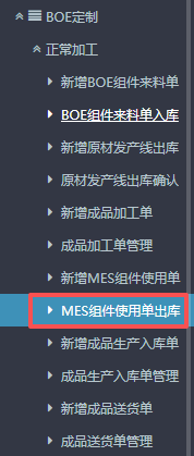 5.提交之后,回到左側(cè)功能菜單找到“MES組件使用單出庫(kù)”。 6.點(diǎn)擊打開(kāi)后,點(diǎn)擊查詢(xún)。如果沒(méi)有找到單子可以填編碼或者名稱(chēng)篩選。 7.查詢(xún)之后,按圖操作:先點(diǎn)擊對(duì)應(yīng)使用單進(jìn)行確認(rèn),然后再進(jìn)行上傳BOE。 ![]() 如果確認(rèn)后發(fā)現(xiàn)有其他問(wèn)題或者需要修改的話(huà),可以點(diǎn)擊對(duì)應(yīng)使用單,點(diǎn)擊“編輯”,然后駁回。重新按照上述流程操作。