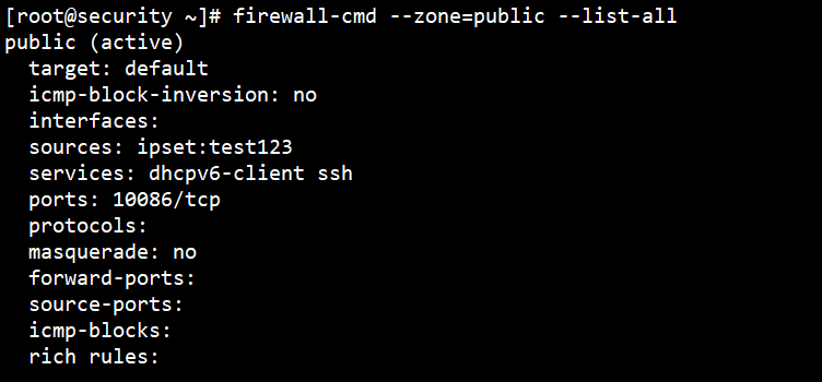 然后使用firewalld --get-ipsets就可以看到 ![]() 看下這個(gè)地址組里面有那些地址 ![]() 看看public這個(gè)區(qū)域的策略情況 ![]() 大家可能也注意到了,我們上述添加策略時(shí)只用了一部分參數(shù),例如區(qū)域、源地址或者目的端口,那么為啥源地址和源端口不一起用呢,那是因?yàn)閒irewalld默認(rèn)上同時(shí)只支持一個(gè)參數(shù)的變化,兩個(gè)參數(shù)會(huì)造成互斥,不像iptables可以加一條參數(shù),有許多參數(shù),當(dāng)然firewalld也有辦法添加多個(gè)參數(shù)的策略,那就是“富規(guī)則”。 該文章在 2025/9/16 12:04:59 編輯過(guò) |