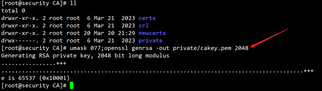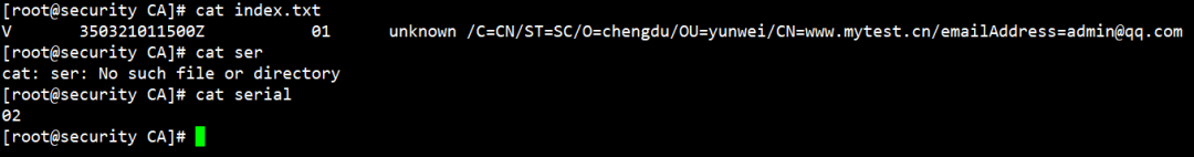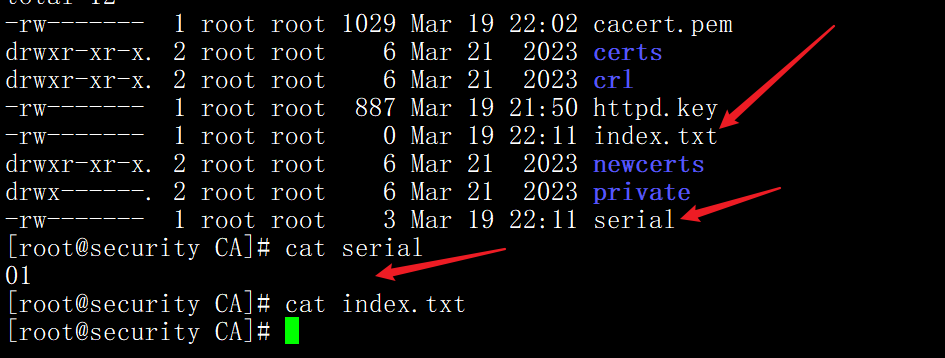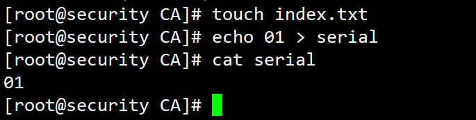 3、執(zhí)行如下命令生成根證書(shū)并且創(chuàng)建兩個(gè)文件,分別是index.txt和serial,index.txt使用touch創(chuàng)建即可,serial中輸入01。openssl req -new -x509 -key private/cakey.pem -out cacert.pem -days 3650