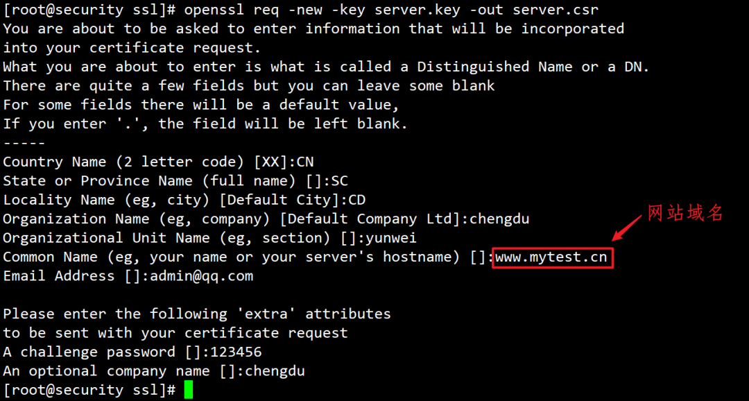 4、找到另外一臺(tái)服務(wù)器,我這里只有一臺(tái)服務(wù)器,到另外一個(gè)目錄創(chuàng)建相關(guān)的證書(shū),假如是/usr/ssl目錄執(zhí)行命令生成證書(shū)簽署請(qǐng)求,其中hostname項(xiàng)為網(wǎng)站域名,其他內(nèi)容都和CA證書(shū)一致openssl req -new -key server.key -out server.csr