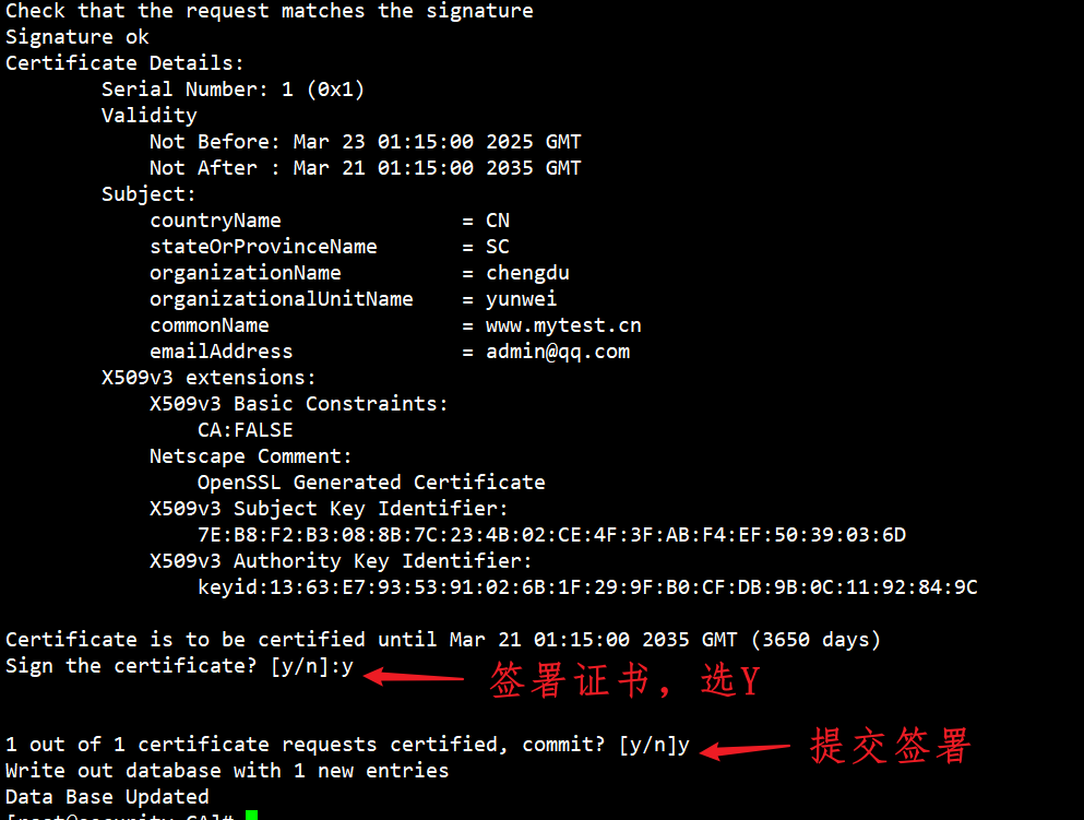 5、用之前生成的CA證書(shū)對(duì)證書(shū)簽署請(qǐng)求進(jìn)行簽名,得到服務(wù)端證書(shū)openssl ca -in /usr/ssl/server.csr -out server.crt -days 3650