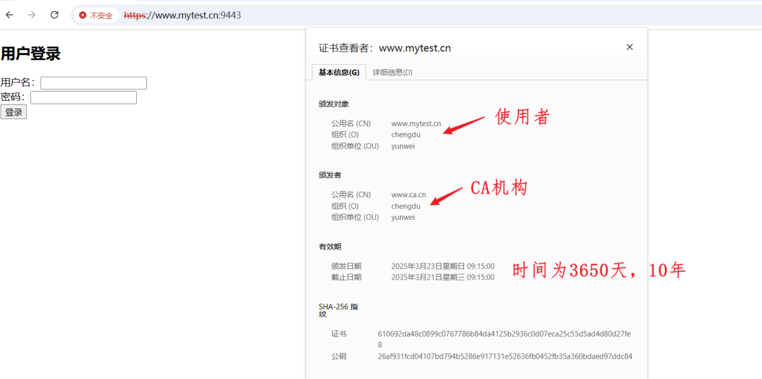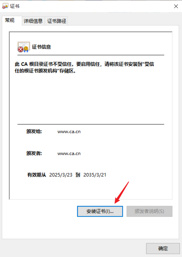 配置完成后使用nginx -s reload重新加載配置,讓其生效,然后配置本地證書(shū)文件和hosts將第三步生成的CA服務(wù)器需要對(duì)外公開(kāi)的證書(shū)文件cacert.pem復(fù)制到電腦本地,后綴名改為crt格式,然后雙擊安裝證書(shū),將其導(dǎo)入到電腦本地顯示導(dǎo)入成功即可,由于www.mytest.cn這個(gè)域名沒(méi)有在DNS域名服務(wù)商哪里注冊(cè),所以需要我們自己在hosts文件中添加域名解析地址,Windows電腦在C:\Windows\System32\drivers\etc下,先將hosts文件拖出來(lái)到桌面,然后修改添加如下內(nèi)容在拖進(jìn)去你的服務(wù)器ip地址 www.mytest.cn