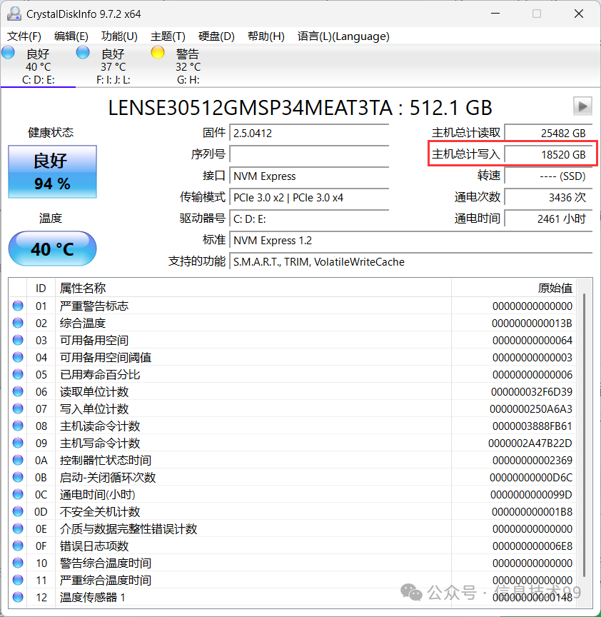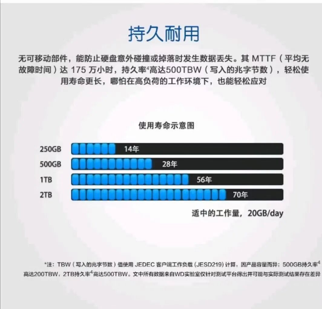 使用CrystalDiskInfo等軟件可以查看固態(tài)硬盤的已寫入量,比如我2019年的筆記本固態(tài)硬盤到現(xiàn)在6年的寫入量是18TB,按最低100T的總寫入量有20%,總共可用30年。但實際上的使用壽命與存儲芯片本身質(zhì)量有關(guān):