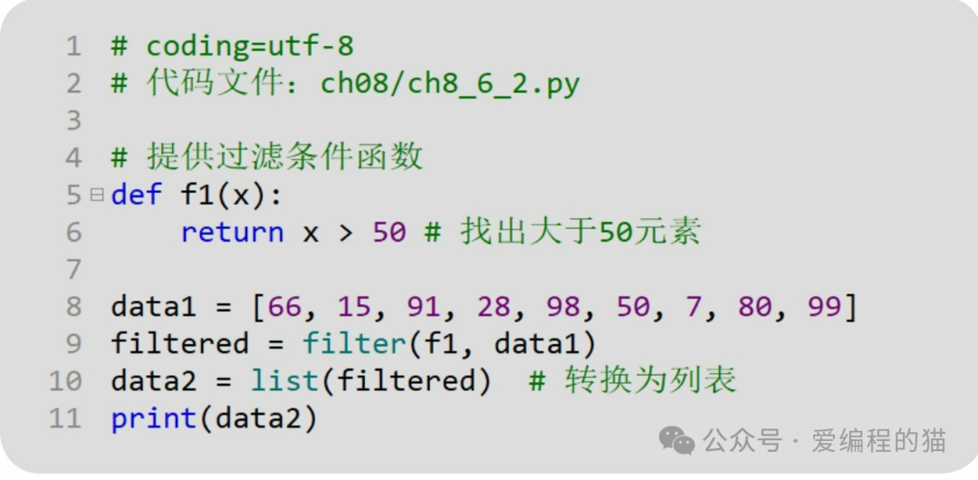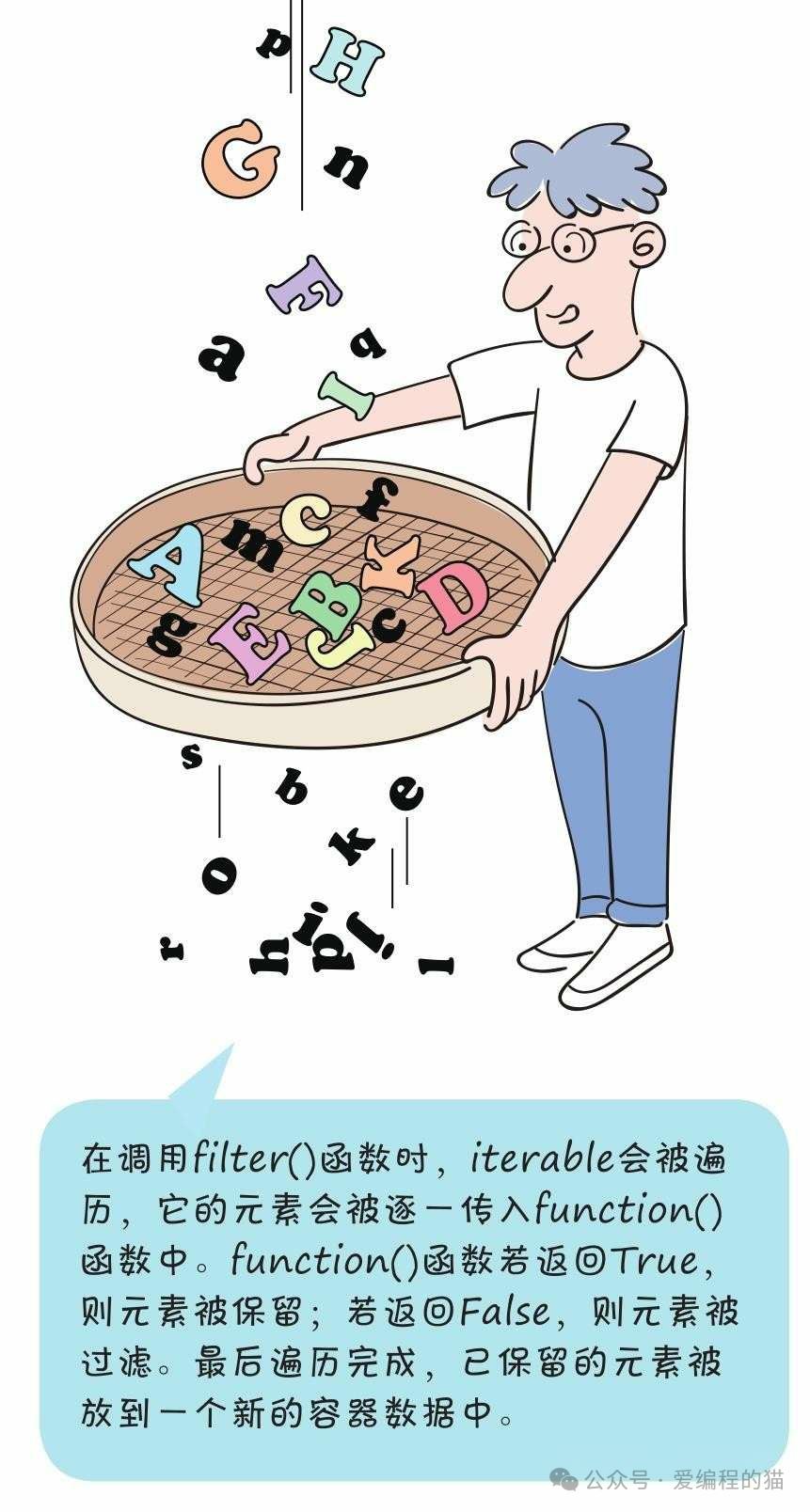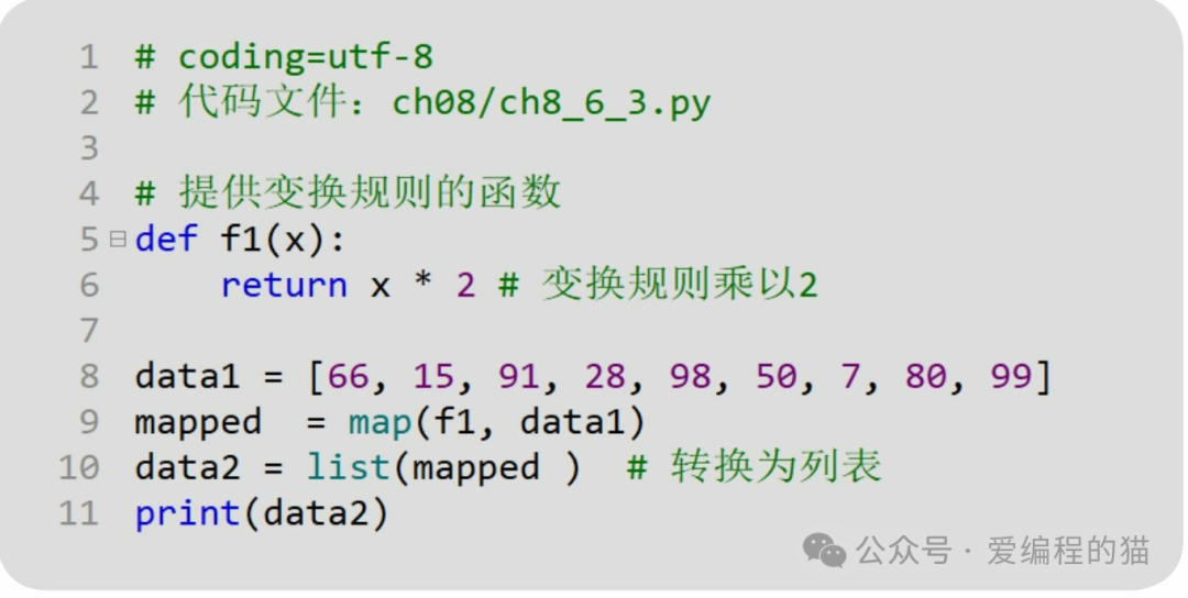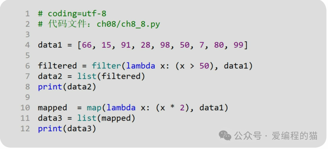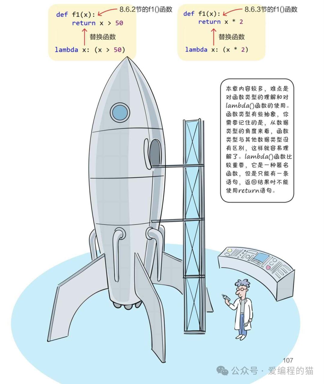 導讀 簡要介紹:本文改編知名作家-關東升,一個在IT領域摸爬滾打20多年的老程序員、軟件架構師、高級培訓 講師、IT作家。 ? ![]() ![]() ![]() ![]() ![]() 在定義好函數(shù)后,就可以調用函數(shù)了,很簡單! 8.2.1 使用位置參數(shù)調用函數(shù) 在調用函數(shù)時傳遞的實參與定義函數(shù)時的形參順序一致,這是調用 函數(shù)的基本形式。 ![]() ![]() 在調用函數(shù)時可以采用“關鍵字=實參”的形式,其中,關鍵字的名稱就是定義函數(shù)時形參的名稱。 ![]() ![]() ![]() ![]() ![]() 8.4.1 基于元組的可變參數(shù)(*可變參數(shù)) *可變參數(shù)在函數(shù)中被組裝成一個元組。 示例代碼如下: ![]() 8.4.2 基于字典的可變參數(shù)(**可變參數(shù)) **可變參數(shù)在函數(shù)中被組裝成一個字典。 示例代碼如下: ![]() ![]() ![]() ![]() ![]() ![]() ![]() ![]() ![]() Python中的任意一個函數(shù)都有數(shù)據(jù)類型,這種數(shù)據(jù)類型是function, 被稱為函數(shù)類型。 8.6.1 理解函數(shù)類型 函數(shù)類型的數(shù)據(jù)與其他類型的數(shù)據(jù)是一樣的,任意類型的數(shù)據(jù)都可 以作為函數(shù)返回值使用,還可以作為函數(shù)參數(shù)使用。因此,一個函數(shù)可 以作為另一個函數(shù)返回值使用,也可以作為另一個函數(shù)參數(shù)使用。 ![]() ![]() ![]() ![]() ![]() add()和sub()函數(shù)有兩個數(shù)字參數(shù),具有相同的函數(shù)類型。sq uare()函數(shù)只有一個數(shù)字參數(shù),所以square()與add()、sub()函 數(shù)的類型不同。 8.6.2 過濾函數(shù)filter() 在Python中定義了一些用于數(shù)據(jù)處理的函數(shù),如filter()和map( )等。我們先介紹filter()函數(shù)。 filter()函數(shù)用于對容器中的元素進行過濾處理。 ![]() ![]() 參數(shù)function是一個提供過濾條件的函數(shù),返回布爾值。 參數(shù)iterable是容器類型的數(shù)據(jù)。 ![]() ![]() ![]() ![]() 8.6.3 映射函數(shù)map() map()函數(shù)用于對容器中的元素進行映射(或變換)。 例如:我 想將列表中的所有元素都乘以2,返回新的列表。 ![]() ![]() 參數(shù)function是一個提供變換規(guī)則的函數(shù),返回變換之后的元素。 參數(shù)iterable是容器類型的數(shù)據(jù)。 示例代碼如下: ![]() ![]() ![]() 我們之前學習的函數(shù)都是有名稱的函數(shù),例如在8.1節(jié)定義的rect_ar ea()函數(shù),rect_area就是其函數(shù)名。我們也可以定義匿名函數(shù),匿名 函數(shù)就是沒有名稱的函數(shù)。 在Python中使用lambda關鍵字定義匿名函數(shù)。lambda關鍵字定義的 函數(shù)也被稱為lambda()函數(shù),定義lambda()函數(shù)的語法如下。 “參數(shù)列表”與函數(shù)的參數(shù)列表是一樣的,但不需要用小括號括起來。 ![]() ![]() lambda()函數(shù)與有名稱的函數(shù)一樣,都是函數(shù)類型,所以8.6.1節(jié) 的add()和sub()函數(shù)可以被lambda()函數(shù)替代。修改8.6.1節(jié)的代 碼示例如下: ![]() ![]() ![]() ![]() ![]() 閱讀原文:https://mp.weixin.qq.com/s/COv9z89qukquBocw7IcAvA 該文章在 2025/9/17 12:48:37 編輯過 |