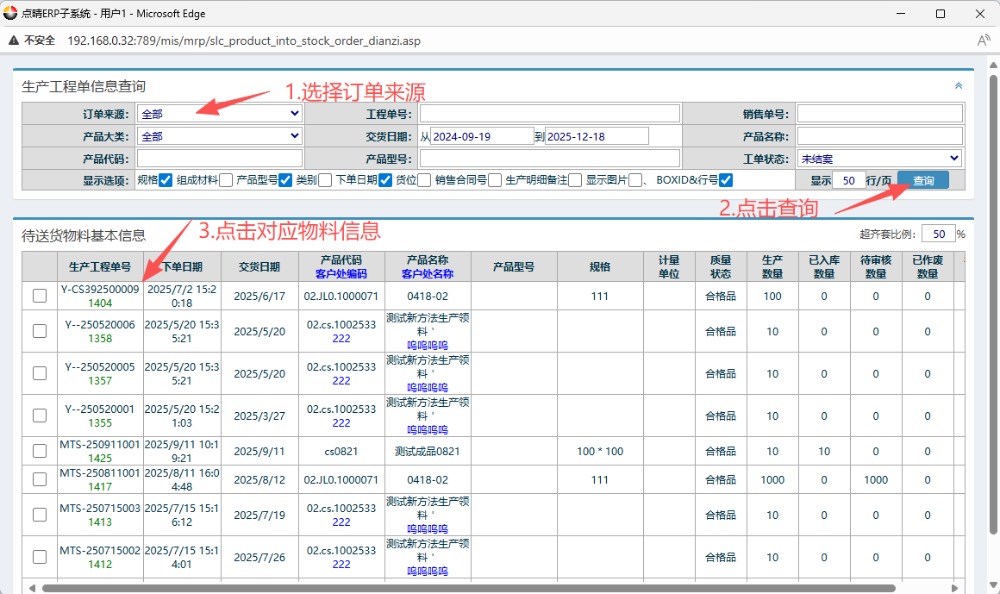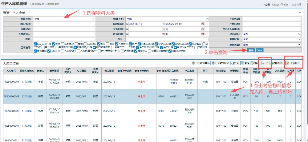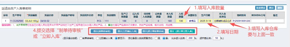 2.進入界面后,按圖操作:點擊選擇入庫倉庫,備注可根據(jù)情況補充。 3.接下來下方點擊“貨品編碼”,會彈出物料信息窗口。 在彈窗的物料信息窗口內,選擇訂單來源,點擊查詢。然后點擊對應物料信息。 4.選好物料之后,按圖操作:填寫入庫數(shù)量、日期以及入庫倉庫(要與上面一致)。然后提交選擇“制單待審核”或“立即入庫”。 注:超訂單是指超出訂單內指定的數(shù)量 5.提交之后,回到左側功能菜單里找到“返退品生產(chǎn)入庫管理” 6.進入界面后,按圖操作:點擊選擇物料大類,點擊查詢。然后點擊對應物料信息,先進行入庫,再上傳BOE。 ![]()