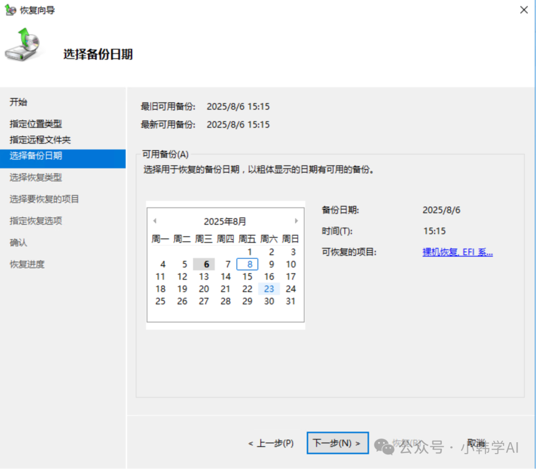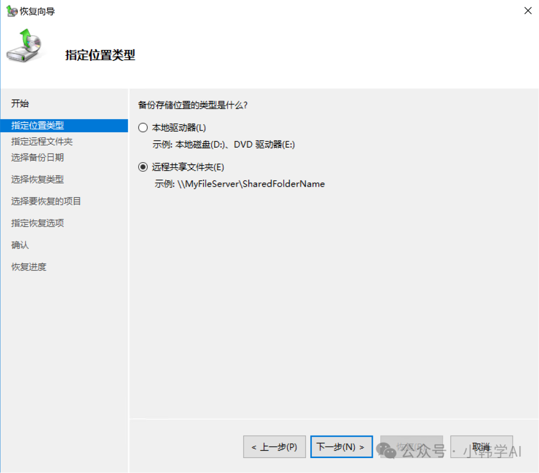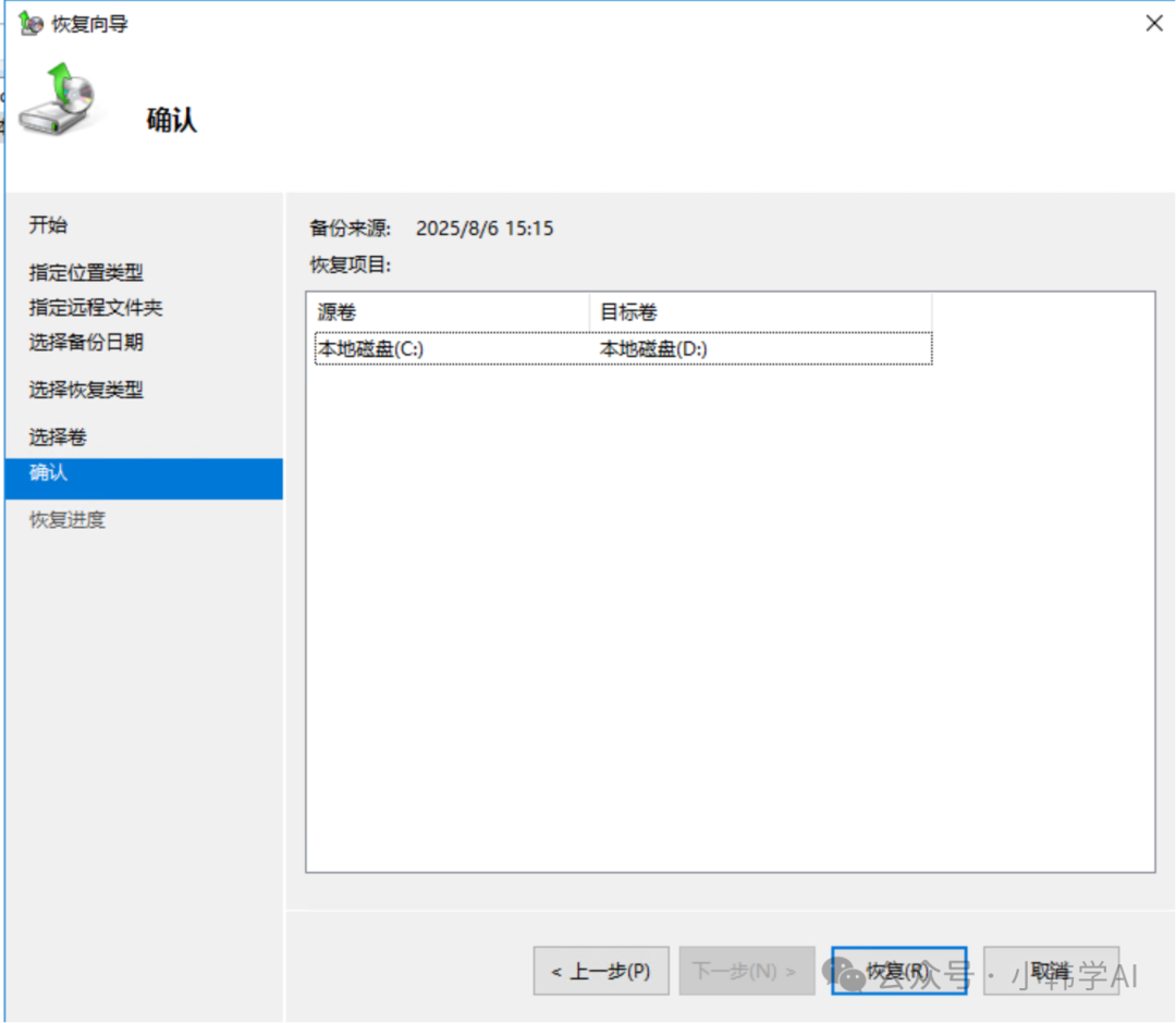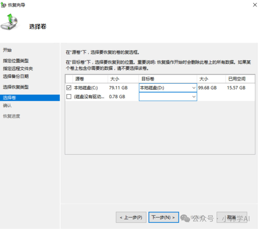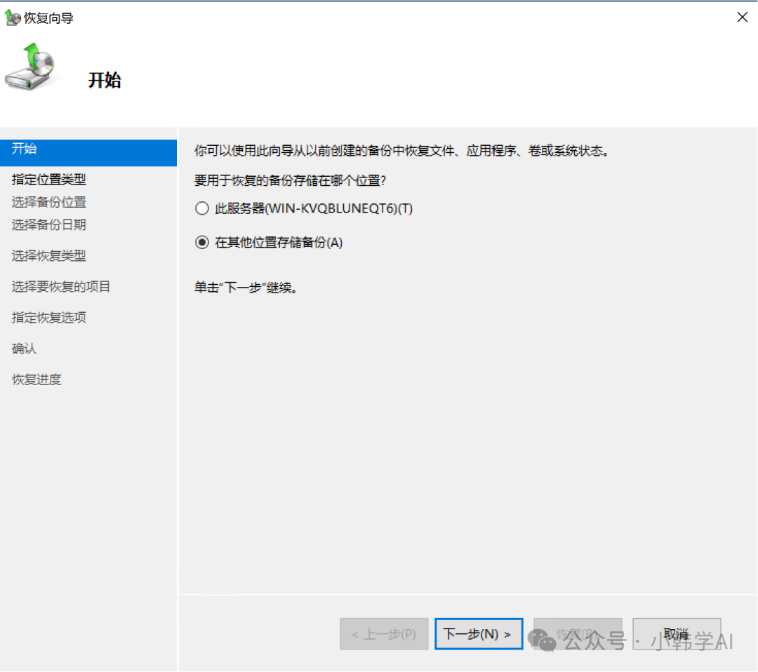 安裝window server backup功能模塊windows server默認(rèn)安裝沒有backup 模塊,需要安裝功能模塊啟動(dòng)windows server backup選擇本地所在地,本機(jī)或者網(wǎng)絡(luò)共享目錄,我這里之前備份在網(wǎng)絡(luò)共享目錄下我這里選擇把備份中的C盤分區(qū)卷,恢復(fù)到這臺(tái)機(jī)器的d盤點(diǎn)擊恢復(fù),即可把備份的C盤恢復(fù)到目標(biāo)D盤。這種恢復(fù)方式無法恢復(fù)EFI引導(dǎo)分區(qū),我們需要重建EFI分區(qū)如果你的需要恢復(fù)的硬盤已經(jīng)有了efi分區(qū),那么執(zhí)行以下命令重建引導(dǎo)文件bcdboot d:\windows /s S: /f ALL