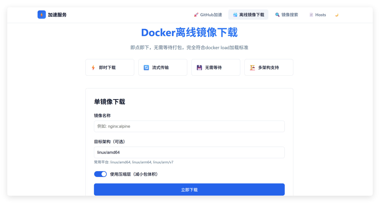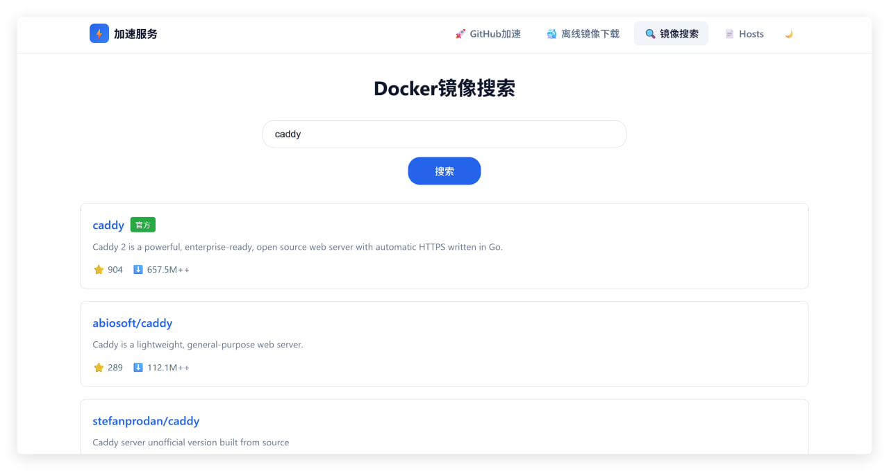 一個(gè)輕量級(jí)、高性能的多功能代理服務(wù),提供 Docker 鏡像加速、GitHub 文件加速、下載離線鏡像、在線搜索 Docker 鏡像等功能。