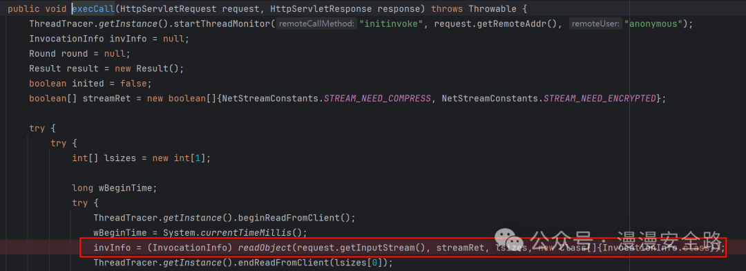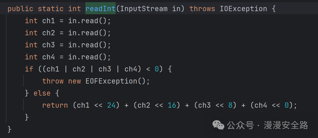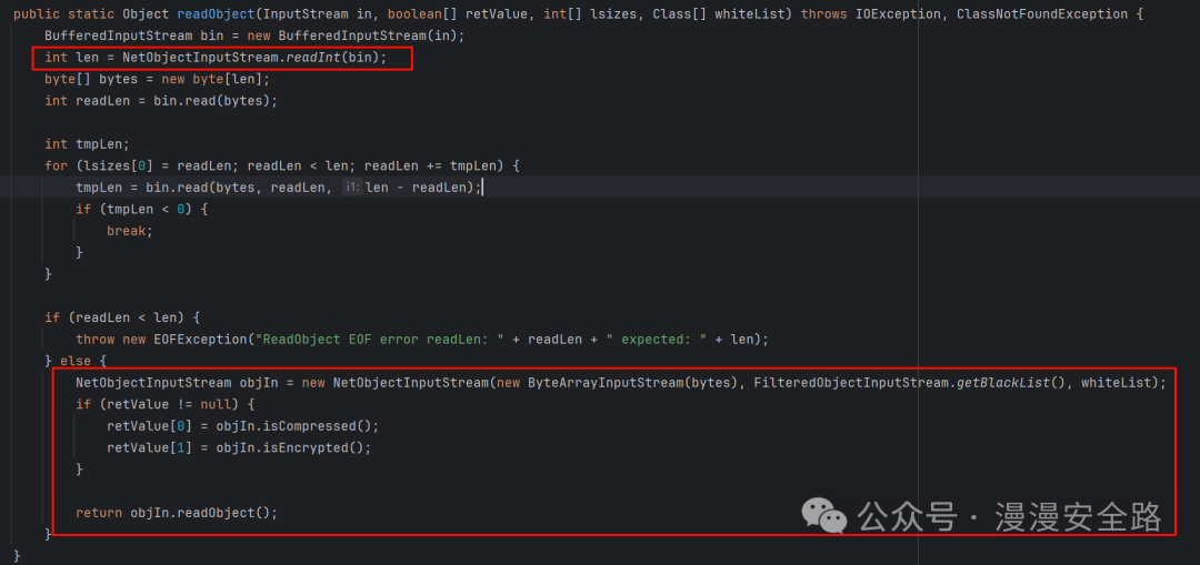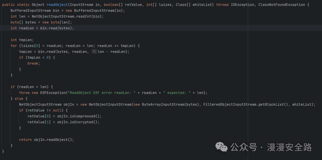 他先檢查了前四字節(jié)然后使用前四字節(jié)計算了數(shù)據(jù)長度判斷是否符合,最后使用nc.bs.framework.comn.NetObjectInputStream#readObject