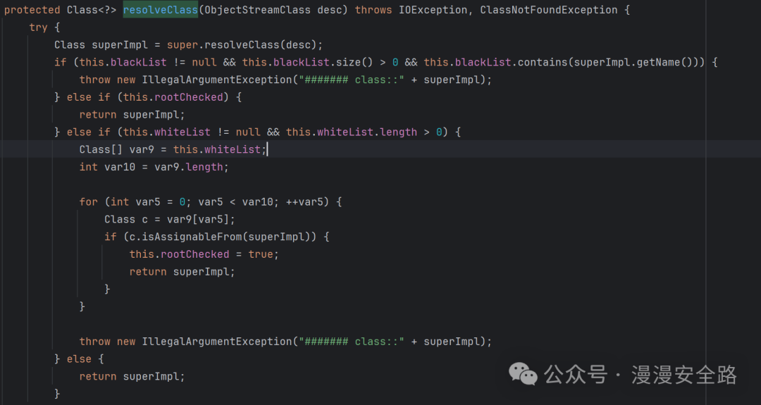所以這里使用白名單修復(fù)了之前的反序列化漏洞 然后我們回到readObject
