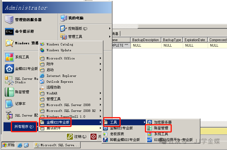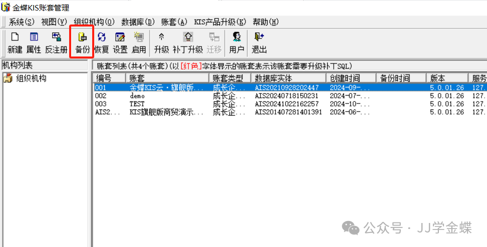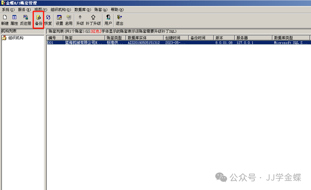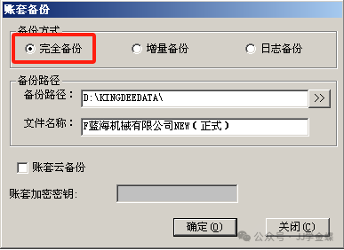 2、金蝶專業(yè)版14.1及以后版本的賬套備份: 服務(wù)器電腦右下角任務(wù)欄雙擊打開【金蝶KIS專業(yè)版系統(tǒng)管理】-賬套后面-更多-手動備份,如下圖所示: 選擇備份路徑,命名備份文件名稱,點(diǎn)【確定】。 其中V16.0功能做了優(yōu)化,增加了圖示功能: 四、金蝶KIS旗艦版的賬套備份: 1、開始-所有程序-金蝶KIS旗艦版-金蝶KIS服務(wù)器配置工具-賬套管理 2、錄入賬套管理密碼,確定,沒有設(shè)置密碼的不用錄入(V7.0出于安全考慮在綜合補(bǔ)丁優(yōu)化了這個功能,強(qiáng)制要求設(shè)置復(fù)雜性密碼)。 3、點(diǎn)中需要備份的賬套,點(diǎn)工具欄【備份】 4、選擇完全備份和備份路徑,錄入備份文件名稱,確定。 在V7.0中綜合補(bǔ)丁對系統(tǒng)管理的功能做了優(yōu)化,也支持與商貿(mào)版和專業(yè)版一樣的賬套管理功能,具體操作不在這里贅述,可以參考商貿(mào)版和專業(yè)版的賬套備份操作。 五、金蝶K/3 Wise的賬套備份: 1、點(diǎn)【開始】-【程序】-【金蝶K3WISE】-【金蝶K3服務(wù)器配置工具】-【賬套管理】 2、錄入賬套管理登錄密碼,無密碼則直接點(diǎn)【確定】(V15.1出于安全考慮在綜合補(bǔ)丁優(yōu)化了這個功能,強(qiáng)制要求設(shè)置復(fù)雜性密碼)。 3、賬套列表中點(diǎn)中需要備份的賬套,點(diǎn)工具欄【備份】 4、備份方式選擇:完全備份,選擇備份路徑,點(diǎn)【確定】。