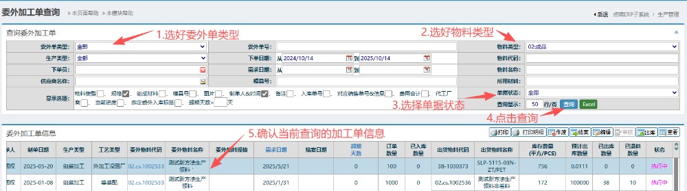 2.進入頁面后,按圖操作:選好委外單類型、物料類型以及單據(jù)狀態(tài),然后點擊查詢。在下方得到當前確認的加工單信息。