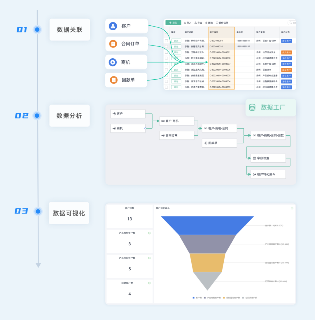 數(shù)據(jù)要看得見。 漏斗圖能幫你一眼看到每個階段的客戶量、轉化率。