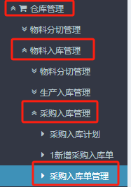 :點(diǎn)晴ERP-采購入庫單管理教程![]() ?1.進(jìn)入ERP系統(tǒng)后,在上方或者左側(cè)點(diǎn)擊“倉庫管理”》“物料入庫管理“》“采購入庫管理”》”采購入庫單管理“。