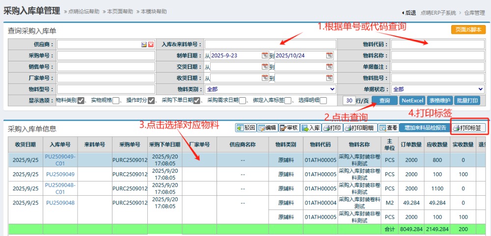 2.進(jìn)入界面后,按圖操作:根據(jù)單號或者代碼查詢,點(diǎn)擊查詢。然后點(diǎn)擊對應(yīng)物料,打印標(biāo)簽。