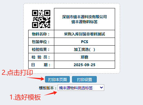 3.點(diǎn)擊”打印標(biāo)簽“后,進(jìn)入到打印頁面內(nèi),先選好模板,然后點(diǎn)擊"打印本頁面"。