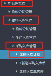 1. 進(jìn)入ERP系統(tǒng),在左側(cè)或者是上方菜單欄上找到”倉庫管理“》”物料入庫管理“》”采購入庫管理“》”采購入庫計劃“
