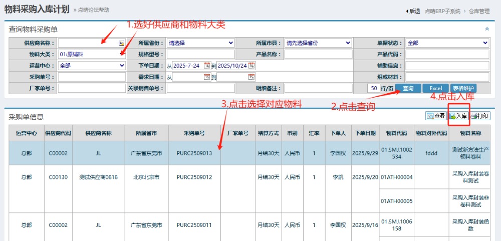 2.進(jìn)入頁面后,按圖操作:選好供應(yīng)商和物料大類,點擊查詢。然后點擊選擇對應(yīng)物料,點擊入庫。