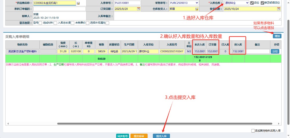 3.點擊入庫后跳轉(zhuǎn)到”新增采購入庫單“頁面,按圖操作:選好入庫倉庫,確認(rèn)好入庫數(shù)量待入庫數(shù)量,最后點擊提交。