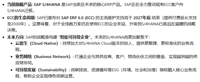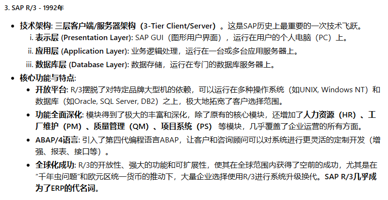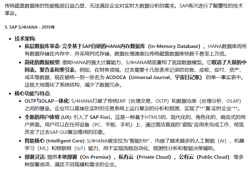 SAP(Systeme, Anwendungen und Produkte in der Datenverarbeitung,即“數(shù)據(jù)處理中的系統(tǒng)、應(yīng)用和產(chǎn)品”)公司于1972年在德國魏恩海姆(Weinheim)成立。其創(chuàng)始人是五位前IBM公司的工程師:Dietmar Hopp, Hans-Werner Hector, Hasso Plattner, Klaus Tschira, 和 Claus Wellenreuther。他們的核心理念在當(dāng)時是革命性的:開發(fā)能夠?qū)崟r處理業(yè)務(wù)數(shù)據(jù)的標(biāo)準(zhǔn)化商業(yè)軟件。在那個年代,數(shù)據(jù)處理通常是批處理模式(Batch Processing),即數(shù)據(jù)被收集起來,在夜間或非高峰時段統(tǒng)一處理,管理者第二天才能看到報表。SAP的“實(shí)時(Real-time)”理念,旨在讓企業(yè)在數(shù)據(jù)產(chǎn)生的那一刻就能進(jìn)行處理和分析,為管理決策提供即時支持。這個初心貫穿了SAP產(chǎn)品演進(jìn)的始終。SAP的ERP產(chǎn)品歷程,是全球企業(yè)信息化發(fā)展的縮影,大致可以分為以下幾個關(guān)鍵時代: 第一階段:大型機(jī)時代 - 奠定基礎(chǔ) (1970s - 1980s) 第二階段:客戶端/服務(wù)器時代 - 稱霸全球 (1990s) 第三階段:互聯(lián)網(wǎng)與平臺化時代 - 延伸與整合 (2000s - 2010s) 第四階段:內(nèi)存計算與云時代 - 智能與簡化 (2015年 - 至今) 現(xiàn)狀與未來展望 (截至2025年10月)希望這份詳盡的解讀能夠幫助您全面了解SAP ERP產(chǎn)品波瀾壯闊的發(fā)展歷程。