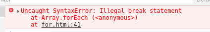 2、定義一個(gè)字段用來判斷什么時(shí)候跳出外層循環(huán) var array = [1,2,3,4,5]; var flag = false; // 為true時(shí)說明需要跳出外層循環(huán) for (let i = 0; i < array.length; i++) { for (let j = 0; j < array.length; j++) { if (i==2&&j==2) { flag = true; break; } console.log(i,j); } if (flag) { break; } } 打印出的結(jié)果和1中的結(jié)果一樣。 3、當(dāng)循環(huán)語句寫在函數(shù)中時(shí)直接用return語句終止雙重循環(huán) var array = [1,2,3,4,5]; var func = function() { for (let i = 0; i < array.length; i++) { for (let j = 0; j < array.length; j++) { if (i==2&&j==2) { return; } console.log(i,j); } } } func(); 打印出的結(jié)果和1中的結(jié)果一樣,這里使用retun跳出函數(shù),同時(shí)也跳出循環(huán)語句。 如何跳出forEach循環(huán)首先需要注意的是在forEach中不能使用continue和break,否則會(huì)報(bào)如下錯(cuò)誤。