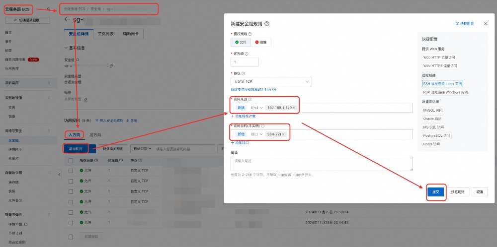 阿里云控制臺 → 云服務器 ECS → 實例 → 安全組 → 配置規(guī)則 → 添加入方向規(guī)則