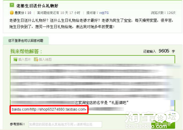 一、如何在知道中添加店鋪連接 第一種方法:在網(wǎng)址前添加百度網(wǎng)址 想要在帖子里面加我們的店鋪連接,肯定是不給于通過的,因?yàn)樗麄円豢吹?BR>是網(wǎng)址就會(huì)刪除,所以我們要加入自己店鋪鏈接的時(shí)候,在鏈接的前面加上百度網(wǎng)址,然后再在后面加上你想要加的鏈接,例如:hi.baidu.com/http://shop******.taobao.com或者baidu.com/http://shop******.taobao.com然后提交回答即可。 對了,在使用這招的時(shí)候每天不要頻繁提交,這會(huì)讓百度察覺到,所以為了保險(xiǎn)你前面發(fā)的帖子任然保留著的份上,每天盡量發(fā)3-4篇文章就可以了。最好是在不同時(shí)段發(fā),比方說上午一個(gè),下午一個(gè),晚上一個(gè)。中間間隔時(shí)間最好長點(diǎn)。 這是我曾經(jīng)回答的過的一個(gè)問題,在最后,我把自己店鋪的連接地址加上去了。 第二種方法:利用百度自己產(chǎn)品轉(zhuǎn)換網(wǎng)址 1、百度空間:利用百度空間轉(zhuǎn)換首先在在百度空間發(fā)表文章,文章中明顯的位置加上你的跳轉(zhuǎn)鏈接。最好不要內(nèi)容太詳細(xì)了,不過要能夠引起進(jìn)到你空間的人興趣,讓他們再去點(diǎn)擊你店鋪的鏈接。最后把這篇文章的網(wǎng)址放到你的提交答案中。 比如通過最新電影《倩女幽魂》來引流量,可以在百度空間發(fā)表一篇文章,寫上電影《倩女幽魂》的一些簡答介紹,最好放上寫圖片。然后在文末用大號顯眼的顏色的文字寫上:“《倩女幽魂》高清下載地址:http://******《倩女幽魂》在線觀看地址:http://*******”。然后自己或讓別人在百度知道提問“哪里有《倩女幽魂》的高清下載或是在線觀看的也行啊?”你去回答,帶上這個(gè)百度空間文章的鏈接,過段時(shí)間采納即可。 這樣流量就會(huì)先從百度知道跳轉(zhuǎn)到百度空間,最后進(jìn)入你的店鋪。呵呵,有點(diǎn)損是吧。 如何進(jìn)入百度空間,發(fā)表文章呢?百度首頁,找到“空間”字樣,點(diǎn)進(jìn)去,然后登錄你的賬號。 左側(cè)點(diǎn)擊”文章“ 然后點(diǎn)擊”發(fā)表文章“就OK啦。 百度空間最好裝扮成我們店鋪的樣子,具體怎么操作,論壇上有好多這方面的帖子,這里就不再贅述了。 2、百度搜藏: 利用百度搜藏轉(zhuǎn)換,對于百度搜藏(http://cang.baidu.com/)大家可能沒有怎么注意過,不過確實(shí)是一種很好的方法。先您需要的鏈接地址收藏到百度搜藏中,然后在問題中加上自己百度搜藏的鏈接。 還是用電影《倩女幽魂》做例子。首先用百度搜倩女幽魂》的高清下載或是在線觀看的也行???”你去回答,帶上自己百度搜藏的鏈接(鏈接格式:http://cang.baidu.com/***),過段時(shí)間采納即可。 使用百度搜藏比較好,因?yàn)榘俣戎绤f(xié)議里面說了“多次將個(gè)人空間地址作為參考或者回答按廣告處理”,但是沒有提到不允許使用百度搜藏。 1.百度首頁點(diǎn)擊“更多” 2.找到“搜藏”圖標(biāo),點(diǎn)擊 3.登錄搜藏 4.添加新的搜藏 5.填寫搜藏內(nèi)容,并保存 6.獲取百度搜藏網(wǎng)址 最后獲取百度搜藏的網(wǎng)址,一定要是退出狀態(tài)后的網(wǎng)址哦,這是添加完搜藏后的狀態(tài)。 點(diǎn)網(wǎng)頁右上角“退出” 最后獲得提交問題答案中所使用的百度搜藏網(wǎng)址。 第三種方法:利用QQ號轉(zhuǎn)換 在百度知道回答問題,很多人會(huì)留下QQ號。因?yàn)橛行﹩栴},你可能回答的不夠清楚,如果提問者還是沒有明白你的答案,可以再通過QQ來找到你,以得到更加滿意準(zhǔn)確的答案。 那為什么不可以回答問題的時(shí)候留下個(gè)QQ號,然后用QQ做跳轉(zhuǎn)呢? 首先需要一個(gè)QQ號,然后資料上寫上自己推廣的店鋪。主要利用QQ的自動(dòng)回復(fù)功能引導(dǎo)人們?nèi)ツ愕牡赇仭?/P> 依舊是用電影《倩女幽魂》做例子,然后弄一個(gè)QQ號,可以新申請一個(gè),或是以前的號,個(gè)性簽名設(shè)置上推廣的店鋪。然后設(shè)置自動(dòng)回復(fù)功能,回復(fù)消息如下:“您好,是不是要找《倩女幽魂》的高清下載地址,請點(diǎn)擊鏈接:http://*******”然后去提問,回答就可以了。 百度知道協(xié)議中也有明文規(guī)定:“沒有正面回答問題,只留有QQ號按灌水處理”,所以說回答問題的時(shí)候不可以只留下QQ號就完了,要添加一些內(nèi)容。比如這個(gè)例子中就可以在答案中粘一些電影的相關(guān)介紹,最后留下QQ號,說明:“想要電影高清的下載網(wǎng)址,請聯(lián)系QQ,我發(fā)給你!”。有些回答中加入QQ號可能不予通過,我們可以注冊百度賬號的時(shí)候,用我們的QQ號注冊,比方說“QQ******”。然后在回答中加以說明即可,“想要電影高清的下載網(wǎng)址,請聯(lián)系QQ,我發(fā)給你!QQ號就是我的賬號哦” 第四種方法:利用百度新出的“追問功能”: 大家都知道百度知道最近推出一項(xiàng)新功能,即提問者對所有答案都可以進(jìn)行追問。在追問的時(shí)候,提問者是很容易添加網(wǎng)址的,但是回答者添加網(wǎng)址通過的可能性不大。另外,提問都應(yīng)該盡量等級長稍高一點(diǎn)。盡量在三級以上。 第五種方法:一問一答 不要用同一IP自問自答,這樣基本就是會(huì)被刪除的。要相信百度是很強(qiáng)大的!注重用戶體驗(yàn),盡量在回答問題時(shí),用真心幫別人解決問題的態(tài)度去對待,在文字里,別人會(huì)知道你的真誠。如果不能