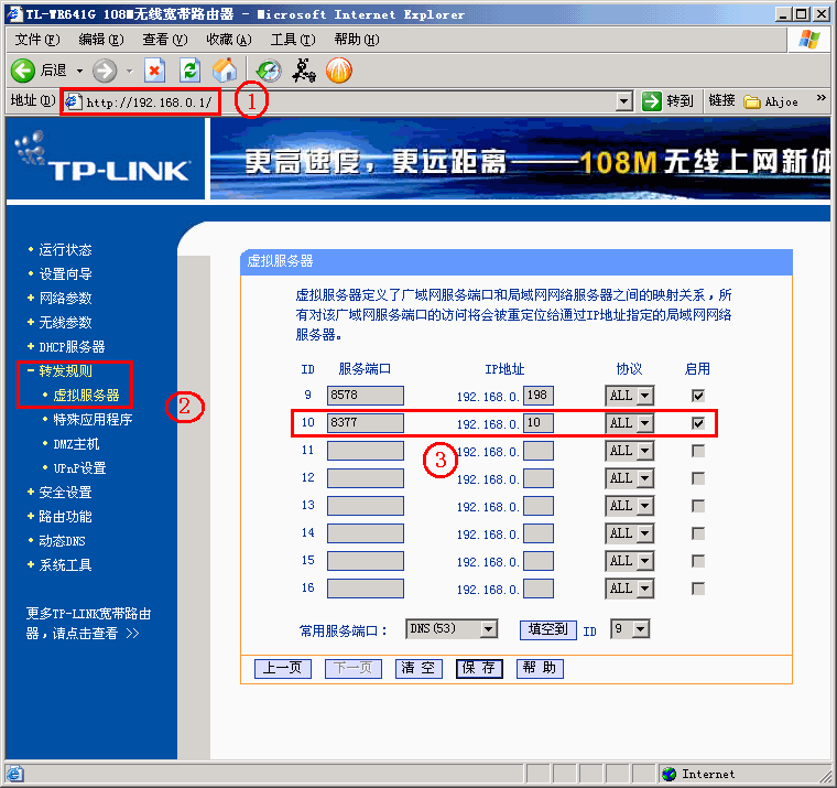 2. 點擊導航欄里的"轉發(fā)規(guī)則", 再點擊"虛擬服務器";