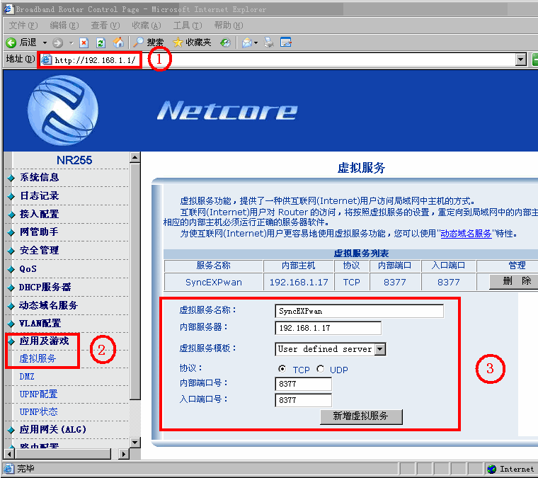 3. 右邊虛擬服務名稱填 SyncEXPwan, 內部服務器填服務端電腦的IP, 協(xié)議 TCP, 內部端口與入口端口都是 8377, 然后點"新增虛擬服務"按鈕,這些設置就添加到了"虛擬服務列表"里了。這樣就設置完成了。