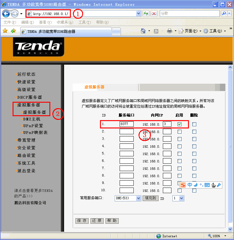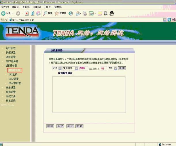 需要將TCP2006端口映射到192.168.0.58。設置方法如下:登陸路由器點擊虛擬服務器,第一個選項設置為啟用,常用端口不需要選擇,常用端口之后設置為2006,IP地址設置為192.168.0.58,協(xié)議選擇為TCP,設置完成后點擊后面的添加按鈕。