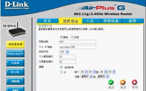 內網(wǎng)192.168.0.188是一臺FTP服務器,F(xiàn)TP服務端口默認為21,需要在路由器上映射21端口到內網(wǎng)的服務器上,設置如下:登陸路由器,默認的管理IP地址為192.168.0.1賬號admin密碼為空。點路由器的進階設定—虛擬服務器進行設置,首先需要在上方點激活,此項設置才生效。網(wǎng)域名稱:此處可隨意填寫;個人IP地址:此處填寫為內網(wǎng)服務器的IP地址192.168.0.188;個人服務端口與公用服務端這2項均設置成21;排程設置成任何時間,最后點擊執(zhí)行,保存此設置。