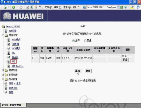 然后在NAT設置中點擊允許,單擊下面的添加按鈕,進入設置界面。