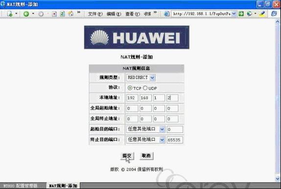 在規(guī)則類型選擇為REDIRECT,協(xié)議選擇TCP,本地地址填寫為本地服務器的IP地址,全局起始終止地址不需要填寫,起始端口和終止端口填上你需要映射的端口號,然后點擊提交。