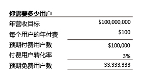大部分免費(fèi)增值公司的付費(fèi)用戶(hù)轉(zhuǎn)化率都在1%到10%之間(平均是在2%到4%之間),而一個(gè)典型付費(fèi)用戶(hù)的開(kāi)銷(xiāo)每年也不超過(guò)幾百美元。所以,假如你想讓公司的年?duì)I收達(dá)到1億美元,那么這就意味著你需要獲取上千萬(wàn)的用戶(hù)(看下面的這個(gè)圖表)。假如你的市場(chǎng)沒(méi)有那么大,那么你在一開(kāi)始就不應(yīng)該套用免費(fèi)增值模式了。