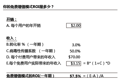 通過(guò)對(duì)比你為服務(wù)這部分免費(fèi)用戶(hù)花費(fèi)的成本,和你通過(guò)這部分人帶來(lái)的付費(fèi)用戶(hù)中獲取的收益,你可以計(jì)算出免費(fèi)增值的ROI(看下面這個(gè)假設(shè)案例):