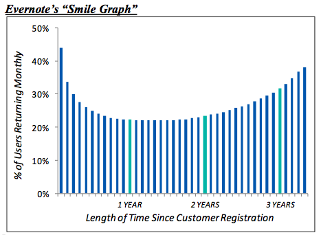 案例:Evernote。在第一天,一個(gè)新的Evernote用戶(hù)看不到什么存儲(chǔ)內(nèi)容,而他唯一能做的是創(chuàng)造新的內(nèi)容出來(lái)。但是,隨著這名用戶(hù)逐漸積累筆記數(shù),他就越有可能會(huì)繼續(xù)回來(lái)用這款產(chǎn)品,而且還會(huì)嘗試不同的方法跟這類(lèi)歷史數(shù)據(jù)互動(dòng)。三年后,一個(gè)Evernote用戶(hù)從這款產(chǎn)品中獲得的價(jià)值跟他們使用產(chǎn)品的第一天相比增長(zhǎng)了,所以他們回來(lái)用這款產(chǎn)品的概率就更大了。盡管大部分產(chǎn)品的用戶(hù)隨著時(shí)間的推移對(duì)一款產(chǎn)品的使用度在下降,但Evernote的情況卻恰恰相反(Evernote的流失率是負(fù)增長(zhǎng)的,看看下面的笑臉你就知道了)。而隨著用戶(hù)通過(guò)他們的免費(fèi)產(chǎn)品獲得越來(lái)越多的價(jià)值,有些用戶(hù)最終被轉(zhuǎn)化成付費(fèi)用戶(hù),給Evernote帶來(lái)了收入。