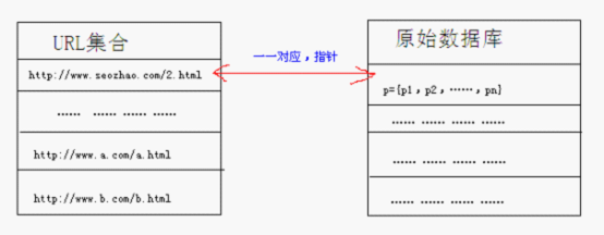 假如蜘蛛爬取的頁面的URL是http://www.seozhao.com/2.html,而搜索引擎在此頁面經(jīng)過上述操作后提取到的關鍵詞集合為p,且p是由關鍵詞p1,p2,……,pn組成,則在百度數(shù)據(jù)庫中,其相互間的關系是一一對應,如下圖。