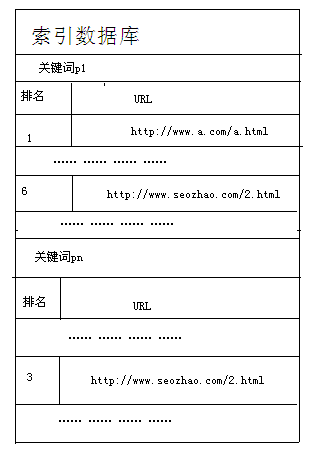 假若http://www.seozhao.com/2.html頁面被切詞成p={p1,p2,p3,……,pn},則其在索引數(shù)據(jù)庫中由下圖方式體現(xiàn)。