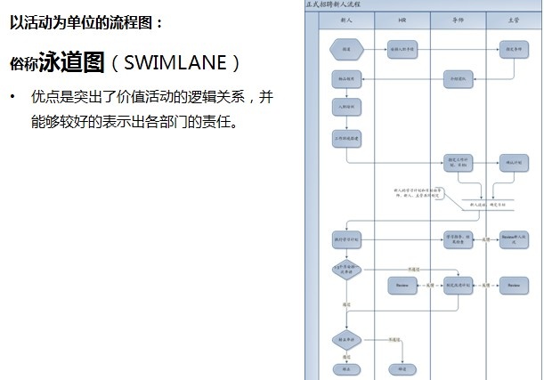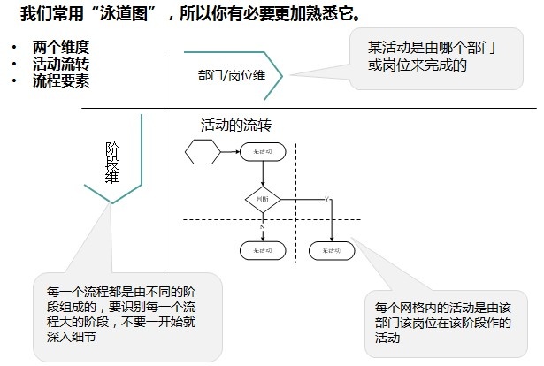 當(dāng)然,除了業(yè)務(wù)流程,系統(tǒng)流程,頁面流程,還有數(shù)據(jù)流程被人關(guān)注。 我們平時(shí)工作中,還會(huì)經(jīng)常聽人談到泳道圖啊,任務(wù)流程圖啊等等概念,究竟是神馬關(guān)系呢? ![]() 圖5:流程圖的分類 本文著重于上述流程中的“業(yè)務(wù)流程圖”——并會(huì)分享如何繪制泳道圖——也即是PD們最多使用,技術(shù)們最多參考,UED們最多看到的流程圖。 本來在第四部分會(huì)對(duì)泳道圖的圖示以及繪制方法、原則做更詳細(xì)的說明,但是看目前的篇幅情況,預(yù)計(jì)會(huì)放到下篇,所以先在這里簡單說明下吧。 在工作中,我們經(jīng)常能夠看到兩種業(yè)務(wù)流程圖,從表現(xiàn)形式來看,一種很好區(qū)分,俗稱為“泳道圖”的它,在樣子上也確實(shí)像個(gè)泳道,可以有橫向的泳道,也會(huì)有縱向的泳道。泳道圖在某些文檔里會(huì)被稱為“以活動(dòng)為單位的流程圖”,浮在泳道中的都是一個(gè)個(gè)活動(dòng)。 ![]() 另外一種類型是以部門和崗位為單位的流程圖,下圖中的圓形就代表一個(gè)個(gè)部門或崗位。矩形代表活動(dòng)。這種流程圖關(guān)注事情如何完成的邏輯,但是在體現(xiàn)各個(gè)部門的責(zé)任上比較弱。如果是某個(gè)崗位的人來看,很難像泳道圖那樣一眼就能看到自己部門的職責(zé)和任務(wù)。所以現(xiàn)在用得比較少。 ![]() 再回過頭來說泳道圖,泳道圖有幾個(gè)關(guān)鍵點(diǎn):兩大維度,活動(dòng)流轉(zhuǎn),流程要素。我們會(huì)在以后詳解。 ![]() 第三部分:為什么需要業(yè)務(wù)流程圖? 流程圖可以提供一種簡單扼要的“縮略俯瞰圖”,幫助觀眾快速了解業(yè)務(wù)如何運(yùn)轉(zhuǎn)。它包含了幾個(gè)關(guān)鍵詞:誰,什么時(shí)候,在什么條件下,做了什么事情,輸入什么,輸出什么,輸出給誰…… 與系統(tǒng)流程不同,業(yè)務(wù)流程更關(guān)注于業(yè)務(wù)本身如何運(yùn)作,講的是業(yè)務(wù)故事,包含的是業(yè)務(wù)規(guī)則。而系統(tǒng)流程則是滿足業(yè)務(wù)流程,實(shí)現(xiàn)部分流程或全部流程的信息化和系統(tǒng)化。 所以業(yè)務(wù)流程是所有環(huán)節(jié)的前置條件——軟件需求分析,信息系統(tǒng)建設(shè)也會(huì)先進(jìn)行業(yè)務(wù)流程的梳理。 下面表現(xiàn)了業(yè)務(wù)流程圖是如何在三個(gè)主要場景中發(fā)揮作用的: 1. 員工培訓(xùn) ![]() 圖6:流程圖的應(yīng)用場景之一:培訓(xùn) 在此場景中:流程圖能夠提供一種快速了解業(yè)務(wù)如何運(yùn)作的視圖,通過業(yè)務(wù)流程圖,新員工能夠快速明白業(yè)務(wù)的最終目標(biāo)是什么,中有哪些角色在參與以及他們的職責(zé),以及彼此之間的聯(lián)接。 除了培訓(xùn)新員工,在員工輪崗、調(diào)職場景中,員工也需要業(yè)務(wù)流程圖參考,明白新的工作內(nèi)容如何開展,以及自己所處的位置,自己的上游是誰,下游是誰,自己需要交付的工作內(nèi)容是什么。 2:流程優(yōu)化與重組 ![]() 圖7:流程圖的應(yīng)用場景之二:流程優(yōu)化 業(yè)務(wù)流程重組(Business Process Reengineering)的存在可以明確反駁:存在即合理。事實(shí)上,存在的業(yè)務(wù)流程并未是合理的,有可能是參與的多個(gè)角色習(xí)慣了某種做法,有可能是變革尚未影響到末端的操作,也有可能缺乏對(duì)于運(yùn)行中的業(yè)務(wù)流程問題的洞察以及強(qiáng)有力的變革推動(dòng)——因?yàn)橐苿?dòng)業(yè)務(wù)流程變革,不是某個(gè)部門的事情,而是需要流程中各個(gè)部門的通力配合。 更多時(shí)候,業(yè)務(wù)流程優(yōu)化是自上而下的,但是老板們未必對(duì)實(shí)際運(yùn)作的業(yè)務(wù)流程那么心知肚明,業(yè)務(wù)流程圖能夠很好去表現(xiàn)這個(gè)“運(yùn)作模型”。通過看業(yè)務(wù)流程圖,找關(guān)鍵節(jié)點(diǎn)的人訪問,能夠直接切入:為什么要這么做,為什么不這么做?從而探索出更深層次的問題,而不是問:你們現(xiàn)在怎么做? 通過調(diào)研,分析業(yè)務(wù)流程圖,引入更多角色,能夠分析出目前業(yè)務(wù)流程的問題:缺失,重復(fù),風(fēng)險(xiǎn),效率等等。從而制定相應(yīng)的優(yōu)化方案。 3:信息化的基礎(chǔ) ![]() 圖8:流程圖的應(yīng)用場景之三:信息化基礎(chǔ) 正如上文所述的餐館夢想的案例,信息系統(tǒng)的一項(xiàng)任務(wù)就是解放員工的手腳,取代一些重復(fù)的人力勞動(dòng)工作。系統(tǒng)上了之后,不是說業(yè)務(wù)流程不需要而是經(jīng)過了一些調(diào)整,其中某個(gè)參與者變成了系統(tǒng),或手持設(shè)備,或打印機(jī)而已。 那么在做系統(tǒng)的功能設(shè)計(jì)和系統(tǒng)流程設(shè)計(jì)時(shí),是不是必須先要了解目前業(yè)務(wù)是如何運(yùn)作的呢?從而更好分析分析,更好說明系統(tǒng)在什么環(huán)節(jié)取代了什么類型的人肉工作? 所以我們看到的PRD往往也會(huì)先以業(yè)務(wù)流程圖開始說明,而敘述一個(gè)系統(tǒng)建設(shè)的好處時(shí),也可以用以前的業(yè)務(wù)流程與系統(tǒng)上了之后的業(yè)務(wù)流程進(jìn)行對(duì)比。根據(jù)分析,將愿景中的新的業(yè)務(wù)流程圖背后需要系統(tǒng)的功能點(diǎn)撰寫清楚。 第四部分:如何繪制業(yè)務(wù)流程圖? 首先繪制業(yè)務(wù)流