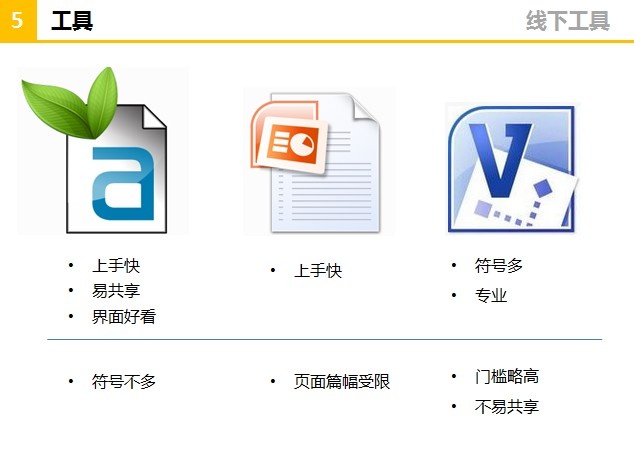 3. 評(píng)審與確認(rèn)——能否真正讓業(yè)務(wù)流程圖反映現(xiàn)實(shí)中的業(yè)務(wù)? 4. 歸檔維護(hù)——流程不斷變更,業(yè)務(wù)流程圖如何快速響應(yīng)? 這些將會(huì)在下篇《業(yè)務(wù)流程圖的繪制流程分享(二)》詳解。 第五部分:繪制工具? 如果不搞工具研討會(huì)的話,這部分比較簡單. Windows: 線下工具大家常用的就是下面三個(gè): 小的流程圖用用PPT就夠了,完了就導(dǎo)出圖片或截圖。交互設(shè)計(jì)師們因?yàn)槌S胊xure繪制線框圖,所以也不必為了流程圖去學(xué)習(xí)新的工具,完全可以用axure的flow控件完成簡單的業(yè)務(wù)流程圖的制作。而PD們則常用微軟的visio。 ![]() 此外,特別推薦一個(gè)軟件:SmartDraw。 我最近的流程圖都是用SmartDraw繪制的,你可以下載一個(gè)免費(fèi)版本體驗(yàn)下。這個(gè)工具不僅僅是為了流程圖而設(shè)計(jì)的,幾乎上包羅萬象:線框圖,流程圖,E-R圖,UML ,韋恩圖,甚至甘特圖,腦圖……沒有像很多人推薦就是因?yàn)樗嫶罅?,尤其是里面的模版。大家體驗(yàn)下: ![]() Mac電腦: 自然要推薦omniGraffle. 繪制出來的任何圖表不知為何總會(huì)覺得很美…… 當(dāng)然,這個(gè)軟件是可以去www.macx.cn下載免費(fèi)版的…… 但是不管windows還是mac,除了線下的工具,還有更多線上的選擇: 不過貌似我們對(duì)線上工具普遍來說都不太放心,是對(duì)服務(wù)器,網(wǎng)速,還有對(duì)GFW不放心吧。 ![]() 這個(gè)是界面做得最好看的一個(gè)工具。我用它來繪制過概念圖(Concept map)。如下圖即是用以上的工具畫的。 ![]() 2. http://creately.com/ ![]() 3. www.lucidchart.com ![]() 轉(zhuǎn)載請(qǐng)注明來處,關(guān)注我請(qǐng)點(diǎn)擊:http://weibo.com/heidixie 該文章在 2012/11/19 9:53:59 編輯過 |