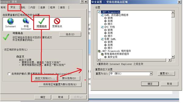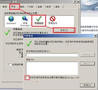 ![]() 處理方法: (1)打開打開點(diǎn)晴MIS系統(tǒng)登陸頁,復(fù)制頁面地址: ![]() ?。?)打開IE [工具]--- [Internet 選項(xiàng)] ![]() 注意:不同版本IE選項(xiàng)的位置可能不同。建議使用微軟IE瀏覽器。 ?。?)進(jìn)入[安全]選項(xiàng) ![]() 操作:依次選擇【安全】---【可信站點(diǎn)】--【站點(diǎn)】。確?!皩?duì)該區(qū)域中所有xxxxx”中的鉤選項(xiàng)為空。 ?。?)將點(diǎn)晴MIS系統(tǒng)網(wǎng)站添加至可信站點(diǎn) ![]() 操作:將(1)中復(fù)制的頁面地址,粘貼至此處(IE可能會(huì)自動(dòng)跳出地址)點(diǎn)【添加】按鈕后,【關(guān)閉】--【確認(rèn)】上述操作。 注意:如發(fā)現(xiàn)列表中已經(jīng)包含該網(wǎng)站地址,可以使用刪除后重新添加的方式。該列表中出現(xiàn)站點(diǎn),將對(duì)其采取不同設(shè)置方式,請(qǐng)確保列表中站點(diǎn)地址是否為合法安全網(wǎng)站。完成這個(gè)步驟后,頁面右下角,將變成“可信站點(diǎn)”字樣,如下圖。 ![]() ?。?)調(diào)整IE對(duì)于“受信任站點(diǎn)”區(qū)域的安全設(shè)置 ![]() 操作:重復(fù)(2)進(jìn)入INTERNET選項(xiàng)。依次選擇【安全】【可信站點(diǎn)】【自定義級(jí)別】 ?。?) 配置受信任站點(diǎn)區(qū)域安全設(shè)置 ![]() 操作:【ACTIVEX 控件和插件】組,建議全部設(shè)置為“啟用”或“提示”狀態(tài)?!酒渌坎糠?,除了“使用彈出窗口阻止程序”以外,也建議全部啟用。 注意:“將文件上載到服務(wù)器時(shí)包含本地目錄路徑”、“通過域訪問數(shù)據(jù)資源”和“跨域?yàn)g覽子框架”項(xiàng),應(yīng)確認(rèn)為“啟用”狀態(tài),該選項(xiàng)可能會(huì)因?yàn)槟撤N原因變更回默認(rèn)的“禁用”。 ![]() ![]() ?。?)確定設(shè)置改動(dòng) ![]() 然后對(duì)前面的兩項(xiàng)“Internet”和“本地Intranet”都要點(diǎn)擊“自定義級(jí)別…”,重復(fù)執(zhí)行以上的設(shè)置,確?!癐nternet”、“本地Intranet”、“可信站點(diǎn)”三項(xiàng)的配置都開放了以上參數(shù):