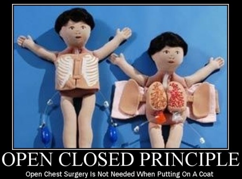 丈夫:很好。這么個(gè),計(jì)算幾何應(yīng)用使 Rectangle 類,圖形應(yīng)用使 RectangleUI 類。咱還可以把這倆類分到倆單獨(dú)的 DLL 中,然后改的時(shí)候就不用管另一個(gè)了。 妻子:謝了,我大概明白 SRP 原則了一句話:SPR 就是把東西分到不能再分了,再集中化管理和復(fù)用。囔,在方法層面上,咱不也得用 SPR 原則?我是說,咱寫的方法里有很多干不同事兒的代碼,這也不符合 SPR原則吧。 丈夫:你說地不差。方法也得分開,一個(gè)方法干一個(gè)活。這么著你復(fù)用方法,要是改了,也不用改太多。 話題:開閉原則作者:“開閉原則“圖示如下: