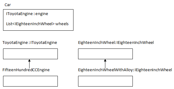 依賴倒置原則圖示 它的意思是: “高層次的模塊不應(yīng)該依賴于低層次的模塊,而是,都應(yīng)該依賴于抽象?!? 作者:我們用一個(gè)現(xiàn)實(shí)的例子來理解。你的汽車是用很多部件組成,比如發(fā)動(dòng)機(jī),車輪,空調(diào)和其他的部件,是吧? 妻子:是啊,當(dāng)然是這樣。 丈夫:你看,它們并沒有嚴(yán)格的構(gòu)建在一個(gè)部件里;就是說,它們都是“插件”,要是引擎或著車輪出了問題,你可以單獨(dú)修理它,甚至換一個(gè)用。 替換時(shí),你只需要保證沉淪符合汽車的設(shè)計(jì)(汽車能使用任何1500CC的引擎或任何18寸的車輪)。 當(dāng)然,你可以在1500CC 的位置上安裝2000 CC的引擎,對(duì)某些制造商都一樣(豐田汽車)。 可如果你的汽車部件不是“可拔插”的呢? 妻子:那太可怕了!這樣的話,要是汽車引擎故障,你得整車修理,或者買一輛新車! 丈夫:是的,那么怎么做到"可插拔"呢? 妻子:關(guān)鍵是”抽象“,是吧? 丈夫:對(duì)?,F(xiàn)實(shí)世界中,汽車是高層級(jí)的模塊/實(shí)體,它依賴于底層級(jí)的模塊/實(shí)體,例如引擎和輪子。 相較于直接依賴于實(shí)體的引擎或輪子,汽車應(yīng)該依賴于抽象的引擎或輪子的規(guī)格,這樣只要是符合這個(gè)抽象規(guī)格的引擎或輪子,都可以裝到車?yán)锱堋? 來看看下面的圖: