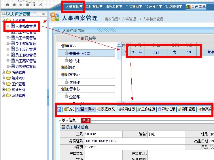 進入人力資源管理子系統(tǒng)后,點擊菜單“人事檔案管理”,然后在出現(xiàn)的頁面中就可以對員工人事信息進行維護更新了: