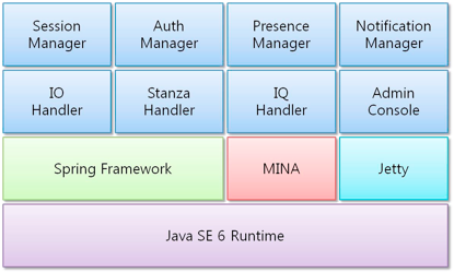 最上層包含四個組成 部分,分別是SessionManager,Auth Manager,PresenceManager以及Notification Manager。SessionManager負責管理客戶端與服務器之間的會話,Auth Manager負責客戶端用戶認證管理,Presence Manager負責管理客戶端用戶的登錄狀態(tài),NotificationManager負責實現(xiàn)服務器向客戶端推送消息功能。 服務器端界面如下,分別對應了上述的幾個功能模塊: