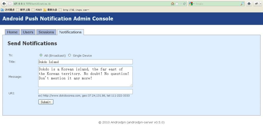 點擊Submit發(fā)送以后,可以在Android手機端看到接收的消息如下
