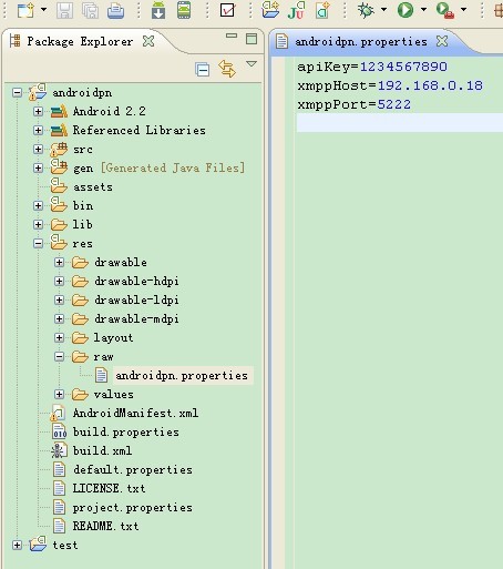 下載了客戶端代碼后需修改androidpn.properties文件中的xmppHost的地址,如下: