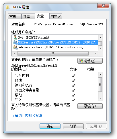 安裝上最新的Visual Stuido 2008 Express SP1,數據庫也安裝了SQL Server 2008 Exrpess。SQL Server 2008 Express版本的SQL Server Management Studio Express(SSMSE)還沒有發(fā)布,2005版本的SSMSE連接不上2008的服務器,現在只能用sqlcmd管理數據庫。 1.將原先分離出來的mdf數據庫文件復制到SQL Server 2008程序目錄下的Data文件夾。 當然,也可以把數據庫文件放到自己喜歡的位置,這樣做需要為文件夾指定權限,使SQL Server能夠有權限使用: ![]() 2.運行“命令提示符”,使用sqlcmd命令連接數據庫服務器。(Vista 用戶注意以管理員方式運行命令提示符) 在SQL Server 2008正確安裝完成后,%Path%環(huán)境變量中會自動加入sqlcmd的執(zhí)行路徑,因此,只要在命令提示符中直接輸入“sqlcmd -S .\SQLExpress”命令即可連接到本地機的SQL Server 2008 Express數據庫服務上: ![]() 3.輸入指令:exec sp_attach_db @dbname=N'數據庫名', @filename1=N'數據庫文件' 其中,“數據庫名”是附加到數據庫后的數據庫名字,“數據庫文件”是需要附加到數據庫的全名。 然后輸入 go 指定執(zhí)行。 如本例: 1> exec sp_attach_db @dbname=N'EquipmentDBMS_wrb', @filename1=N'C:\Program Files\Microsoft SQL Server\MSSQL10.SQLEXPRESS\MSSQL\DATA\EquipmentDBMS_wrb_Data.MDF' 2> go 4.數據庫附加完成,打開數據庫測試。 使用 use 指令打開數據庫,然后寫一條 SELETE 語句。如下圖,可以看到,數據庫已經成功附加完成: ![]() 最后,輸入 exit 退出 cmdsql 。