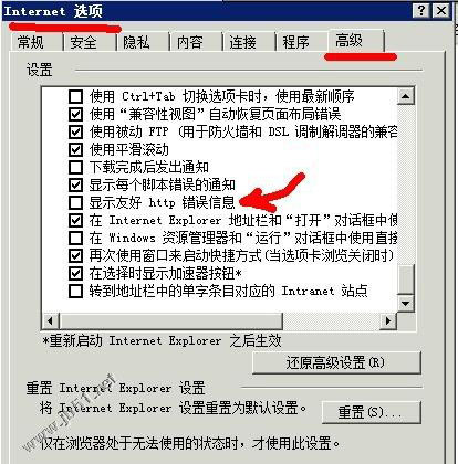 上面顯示的是IIS的友好報(bào)錯(cuò),按下面的步驟把詳細(xì)錯(cuò)誤顯示出來(lái)! 1、首先進(jìn)入點(diǎn)晴OA所在的服務(wù)器,進(jìn)入:開始-》控制面板-》管理工具-》Internet 信息服務(wù)(IIS)管理器,在IIS管理器→ASP里,把錯(cuò)誤信息發(fā)送到瀏覽器這個(gè)選項(xiàng)開啟(True),具體如下圖所示: 2、然后進(jìn)入用戶自己的個(gè)人電腦,打開IE瀏覽器,選擇“Internet 選項(xiàng)”: 取消勾選“顯示友好 http 錯(cuò)誤信息”,然后就可以看到真正的錯(cuò)誤原因了。