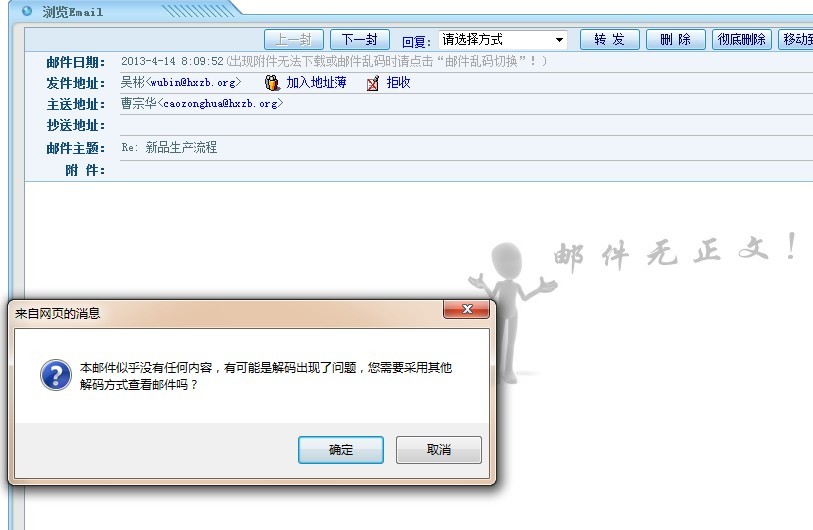 點晴永久免費OA郵件提示“本郵件似乎沒有任何內(nèi)容,有可能是解碼出現(xiàn)了問題,您需要采用其他解碼方式查看郵件嗎”