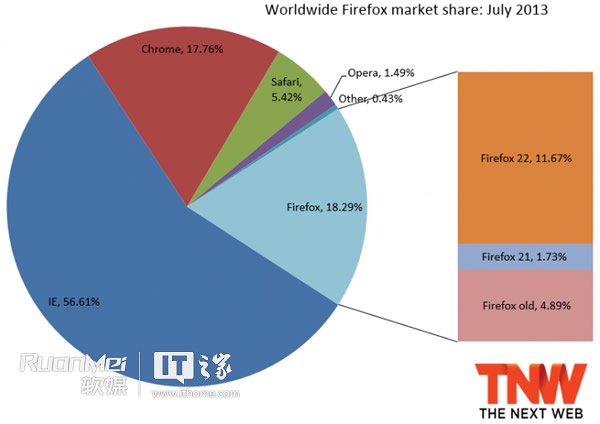 Firefox在7月份的表現(xiàn)很差,份額大幅降至18.29%;上一次看到Firefox的份額接近18%還是2008年5份的事情。Firefox22在發(fā)布后的第一個(gè)滿月份額達(dá)到了10.21%。